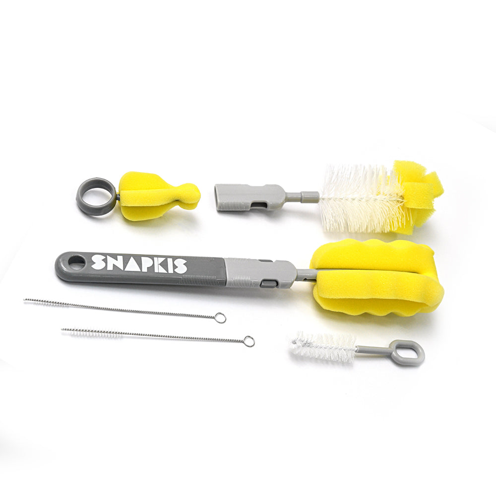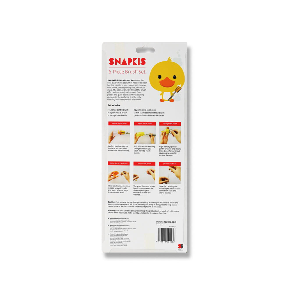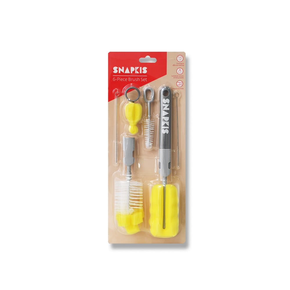 - Snapkis 6-Piece Brush Set covers the best assortment of brushes needed to clean bottles, pacifiers, teats, cups, milk powder containers, breast pump parts and much more.